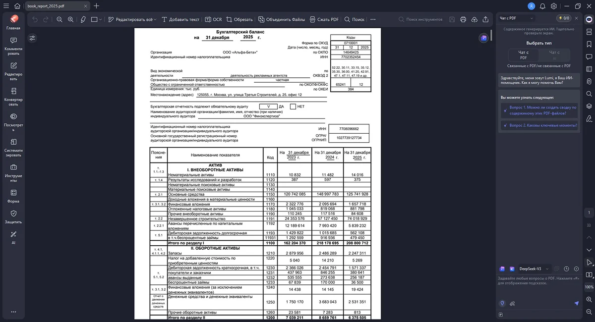 Одна из самых функциональных альтернатив Adobe Acrobat: разработчики снабдили программу большим числом нейроинструментов, максимально упрощающих работу. ИИ-технологии в PDFelement используются для OCR-распознавания символов на 130+ языках с последующим переводом, проверки орфографии и синтаксиса, а также создания резюме по содержимому.