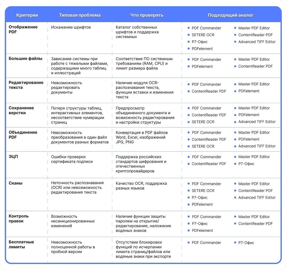 При выборе PDF-редактора сегодня особенно важна доступность в России: возможность прямой оплаты без посредников, регулярные обновления и оперативная техподдержка. По функционалу в приоритете остаются просмотр и печать, редактирование содержимого, функция оптического распознавания текста (OCR) на сканах и фото, конвертация в популярные форматы, объединение и разделение файлов. Для бизнеса также критична поддержка ЭЦП и надежная защита данных.