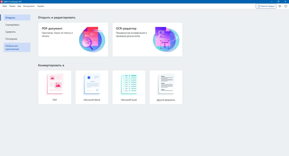 В ABBYY FineReader на стартовый экран вынесены ключевые функции: можно сразу перейти в режим PDF-документа для просмотра, редактирования и подготовки к печати, открыть модуль сканирования или конвертер, сравнить версии документа. Но понять, какие функции есть в модулях, нельзя до открытия файла.