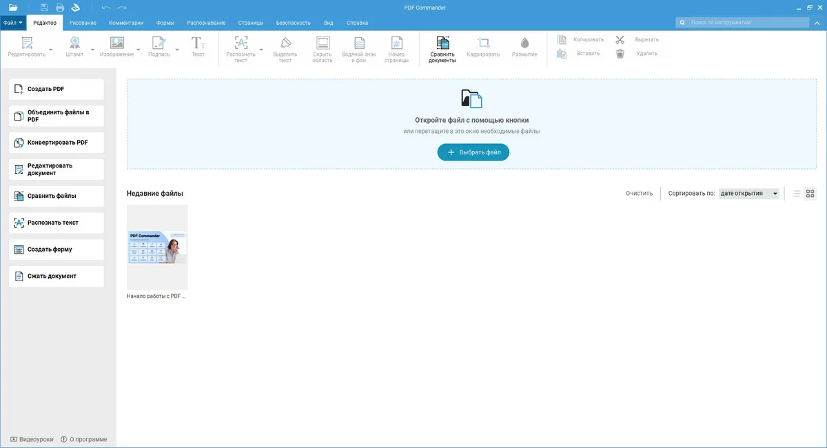 Интерфейс рабочего окна интуитивно понятен. Все инструменты логично распределены по разделам: «Редактор», «Безопасность», «Формы», «Распознавание» и др. Каждая функция обозначена значком и подписью. Реализован принцип работы в одном окне — все операции выполняются в единой вкладке: можно последовательно добавлять комментарии, вносить правки в текст, вставлять изображения.