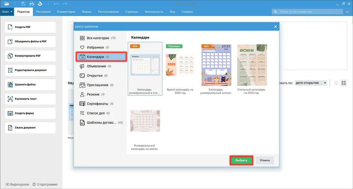 - 2. В библиотеке найдите раздел с макетами. Найдите подходящий формат — например, настенный календарь, и кликните «Выбрать».