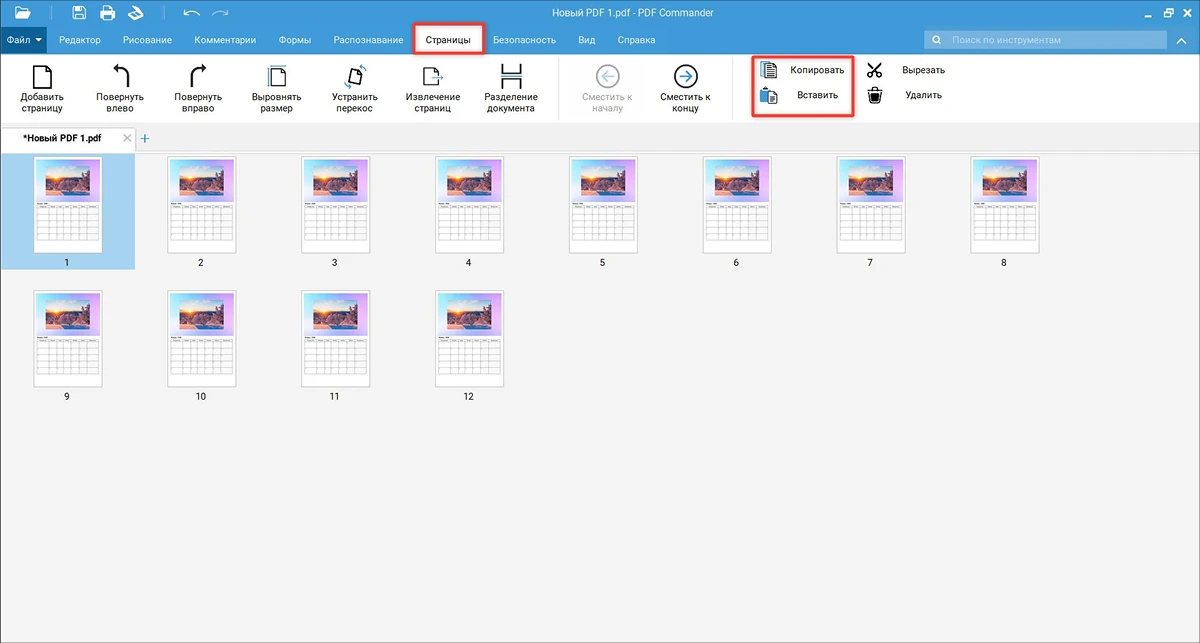 - 3. Создайте копии страницы. Перейдите во вкладку «Страницы» → «Копировать» → «Вставить» и продублируйте текущий лист 11 раз. Всего у вас должно получиться 12 страниц для каждого месяца календаря.