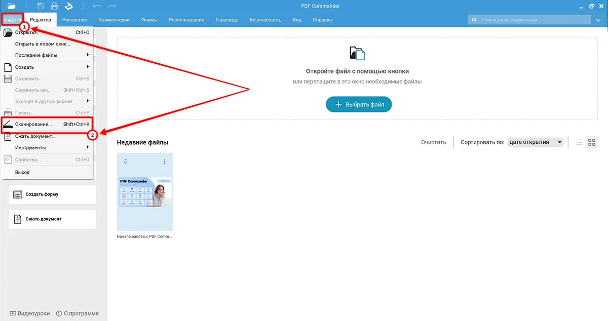 1. Установите софт и запустите его. На панели инструментов нажмите «Создать» → «Сканер».