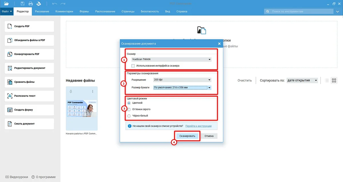 2. Запустите PDF Commander и щелкните на значок сканера.