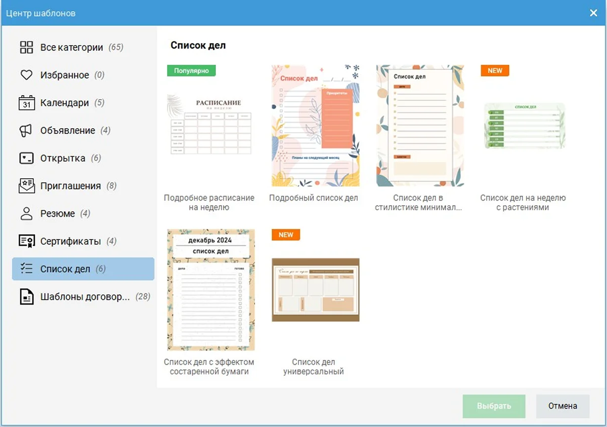 Вы не только можете создавать файлы с нуля или редактировать существующие, но и использовать готовые шаблоны. В каталоге собраны макеты для самых разных задач: открытки и приглашения, календари, списки дел, объявления, резюме.