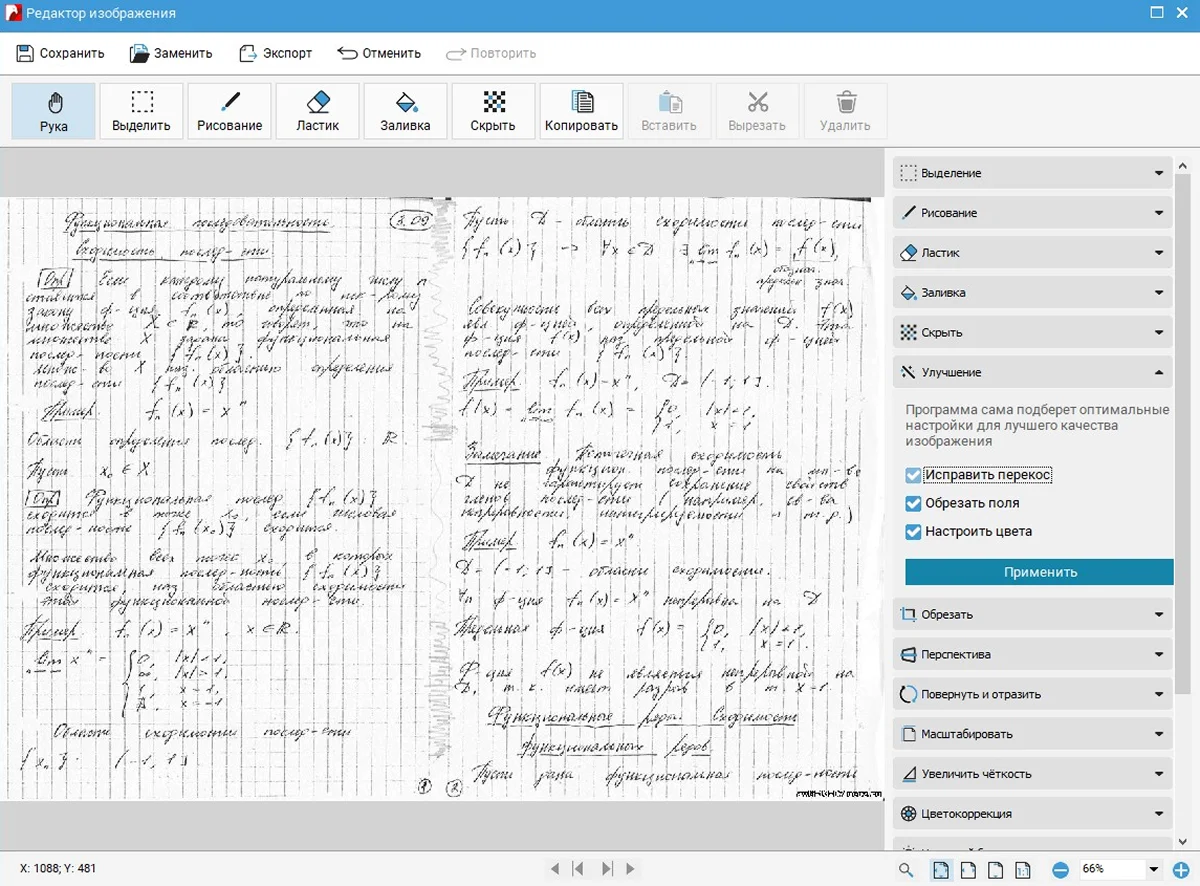 Софт оснащен функцией сканирования — для учителей это отличная возможность оцифровать накопившиеся за годы работы архивы. Если бумага пожелтела от времени, а буквы расплылись, воспользуйтесь редактором, чтобы улучшить качество скана: усилить четкость, устранить перекосы, настроить цвета.