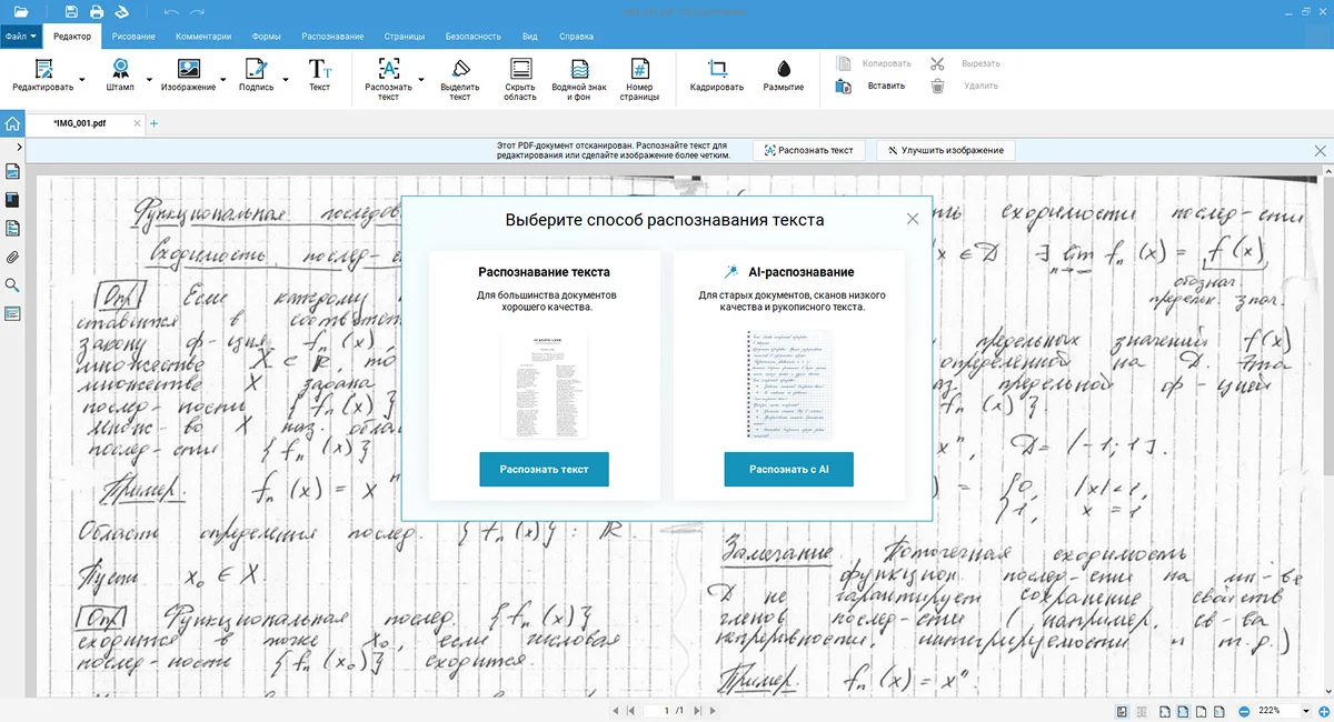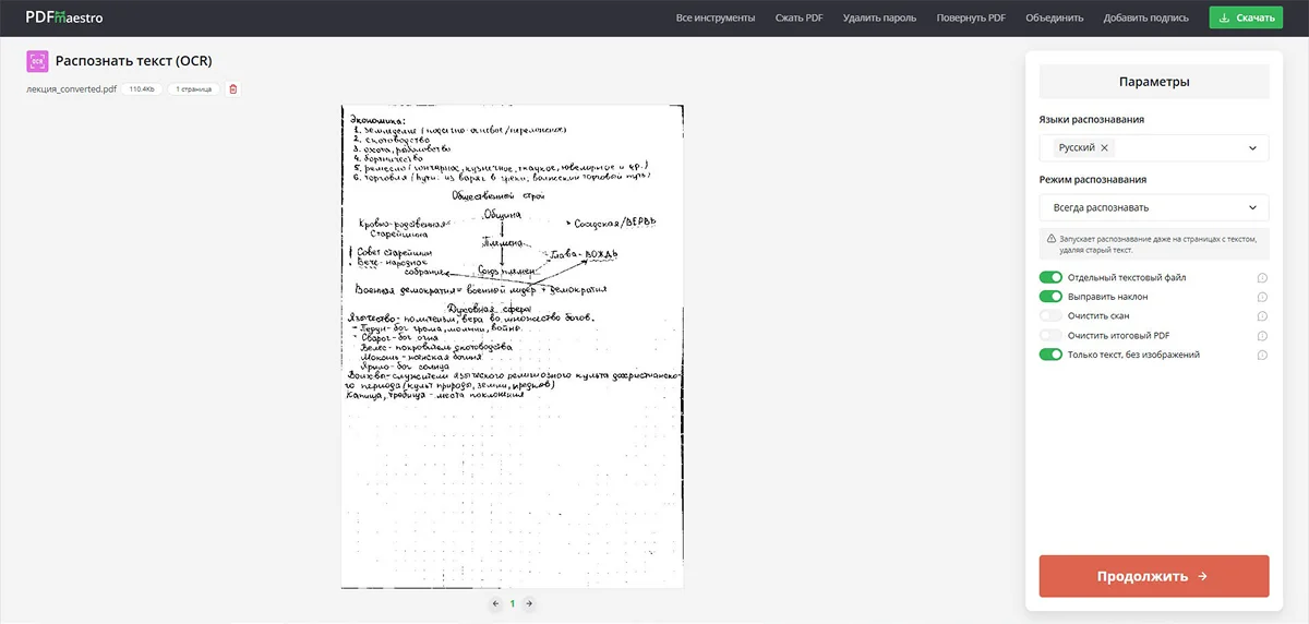 С помощью инструмента оптического распознавания текста (OCR) вы сможете преобразовать журнальные статьи, методички и даже конспекты в редактируемый формат. Благодаря нейросетевым технологиям программа понимает даже рукописные заметки на 100+ языках.