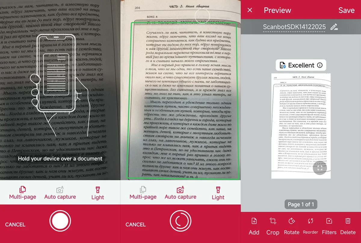 - камера приложения автоматически фокусируется на странице, позволяет снимать даже под углом и потом исправлять перспективу.