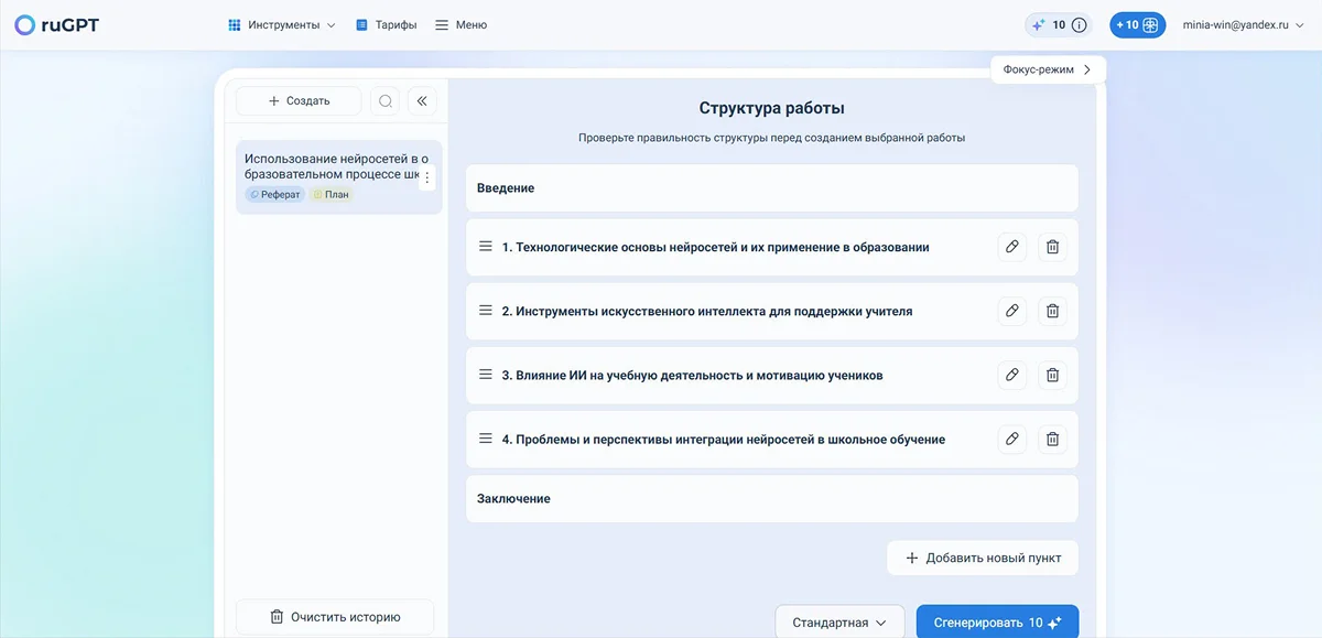 С помощью этого AI-сервиса можно генерировать с нуля и делать рерайт статей, докладов и рефератов по различным школьным предметам, создавать презентации по заданному сценарию. На платформе представлены передовые модели нейросетей — можно выбирать ИИ, наиболее эффективный для решения конкретных задач.