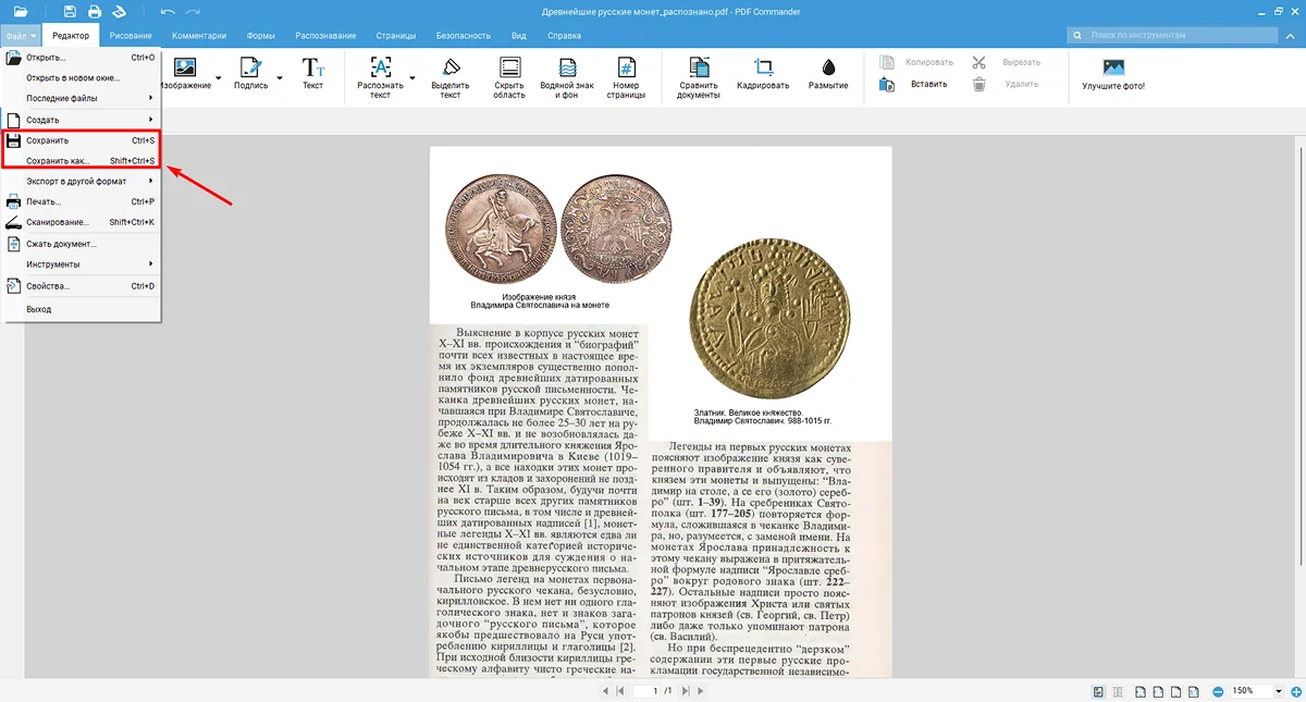 6. Сохраните PDF кнопкой со значком дискеты или воспользуйтесь меню «Файл».