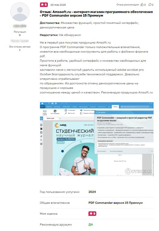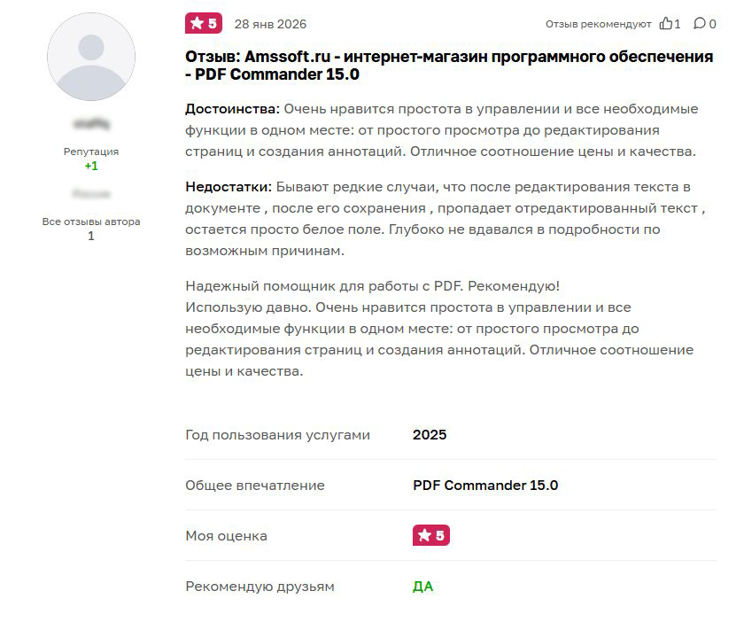 Не в первый раз покупаю продукцию Amsoft.ru О программе PDF Commander только положительные впечатления, имеются все необходимые инструменты для работы с файлами формата pdf. Простота в работе, удобный интерфейс и множество необходимых для меня функций заставили меня с легкостьб удалить используемый adobe acrobat pro Особая благодарность службе технической поддержки. Довольно оперативно отрабатывают по обращениям. Из достоинств отмечу демократические цены на продукцию и хорошее соотношение между ценой и качеством. Рекомендую продукцию Amsoft.ru