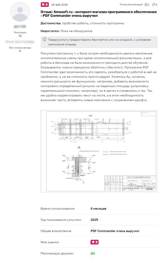 PDF Commander очень выручил Достоинства: Удобство работы, стоимость программы Недостатки: Пока не обнаружила Покупала программу т. к была острая необходимость делать несложные исполнительные схемы при сдаче исполнительной документации, а для работы в Автокаде не было возможности проходить долгое обучение. Оказывается, можно прекрасно обойтись и без этого. Программа PDF Commander дает возможность это сделать, разобраться с работой в ней не проблемно, а уж ее стоимость просто радует. Хотелось бы, конечно, немного расширить ее функционал, например, добавить возможность копировать определенный рисунок на заданную площадь (штриховку параллельными линиями, например), но в целом я справилась и так. Так же удобно корректировать текст на листе, а в этом необходимость возникает часто, вставлять новые пояснения с сохранением шрифта.